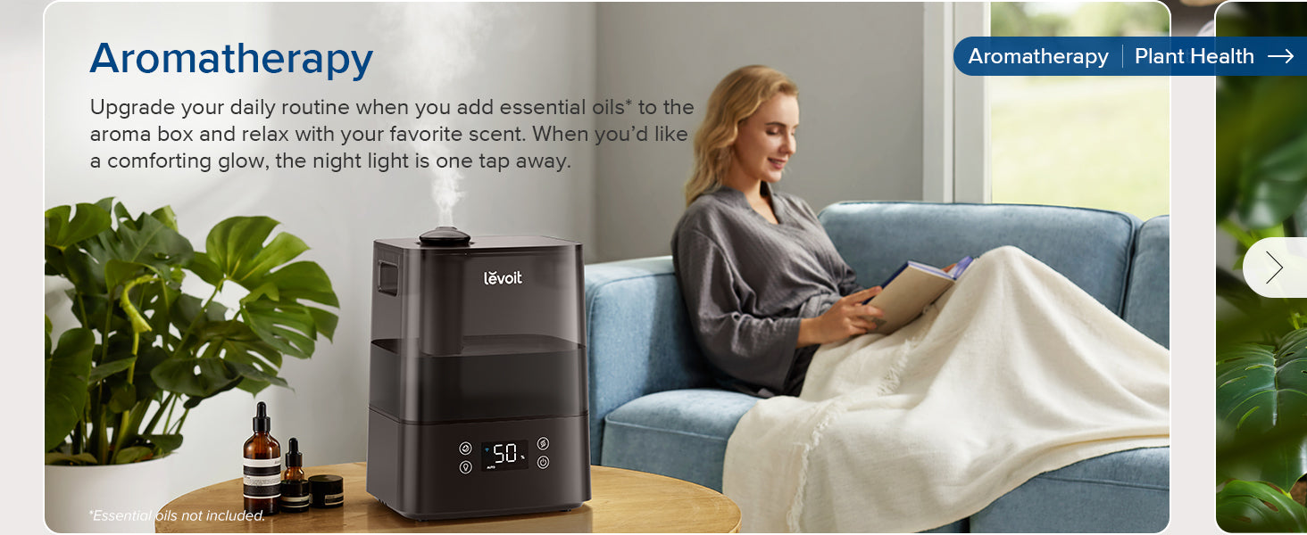 For en ekstra behagelig atmosfære kan du tilsette eteriske oljer i den innebygde aromabeholderen, slik at hjemmet fylles med avslappende dufter samtidig som luftfuktigheten holdes på et optimalt nivå. Luftfukteren har også et valg av 7 LED-farger, som kan gi en koselig og beroligende belysning – perfekt for kveldsbruk eller som nattlys.