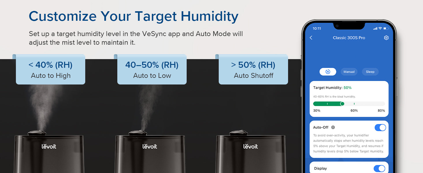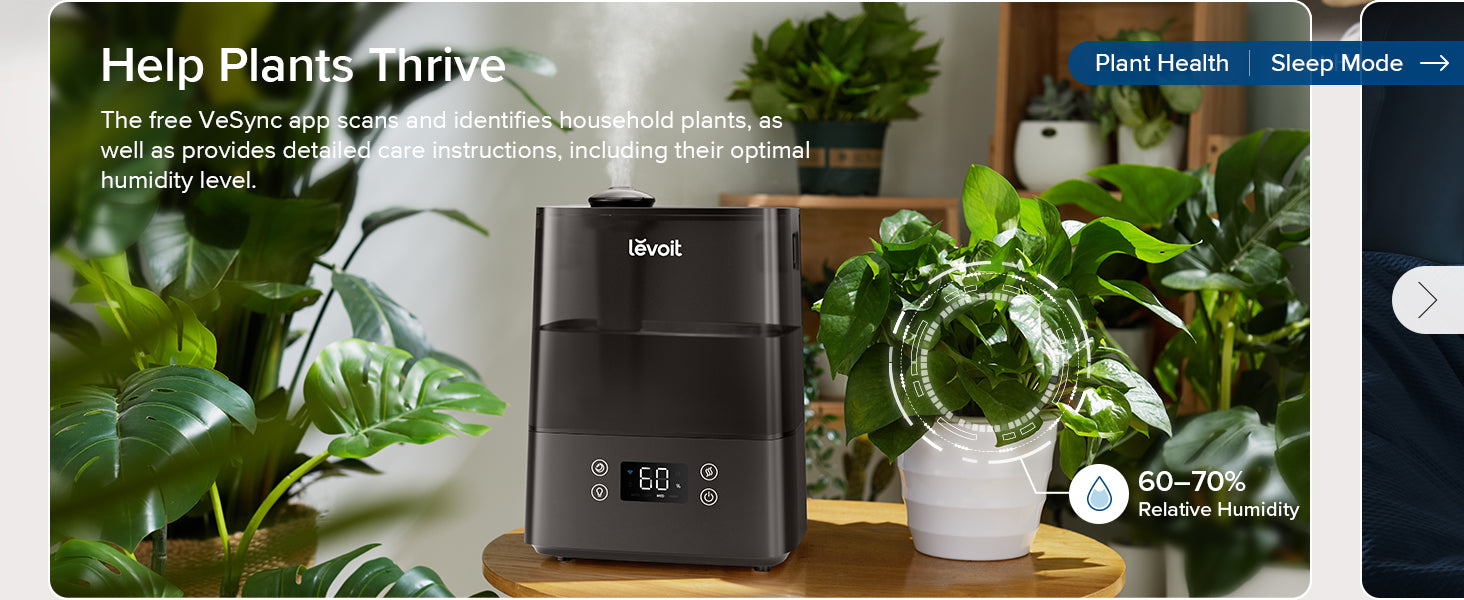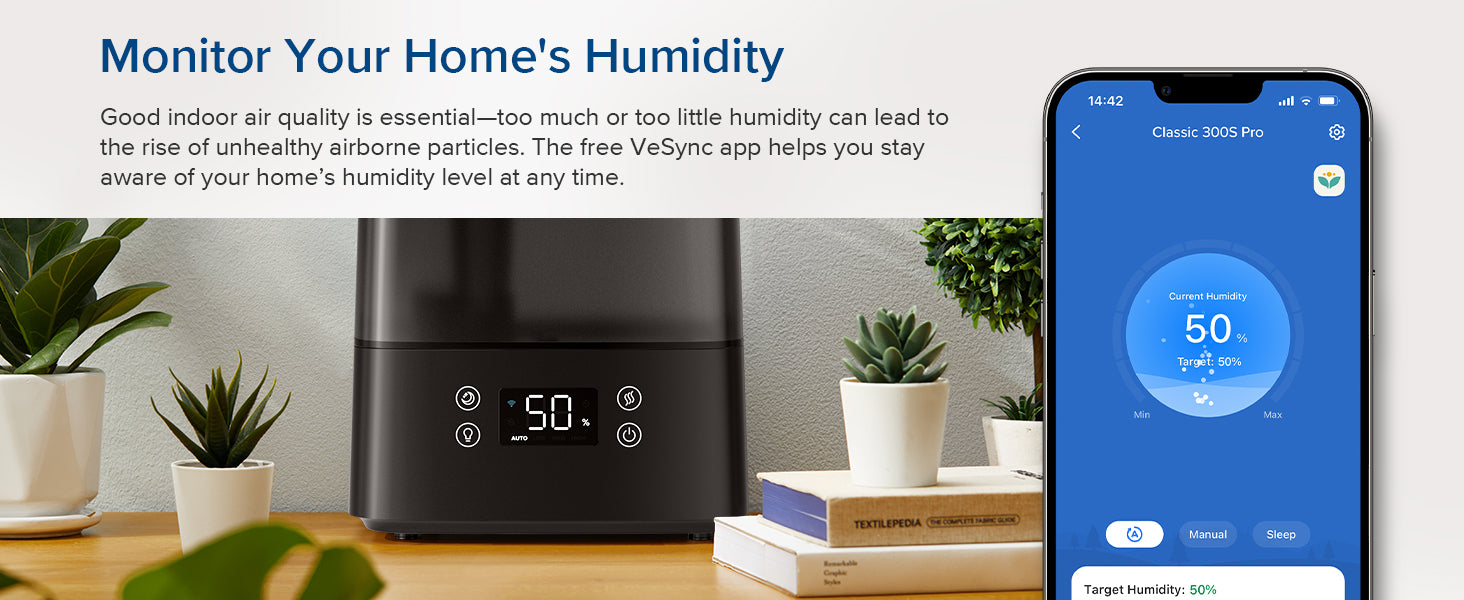 Styr luftfukteren enkelt via VeSync-appen, hvor du kan justere innstillinger og fuktighetsnivåer uansett hvor du er. Den er også kompatibel med Alexa og Google Assistant, slik at du kan bruke stemmestyring for en enda enklere og mer praktisk opplevelse. Alt du trenger er et stabilt 2.4GHz Wi-Fi-nettverk.