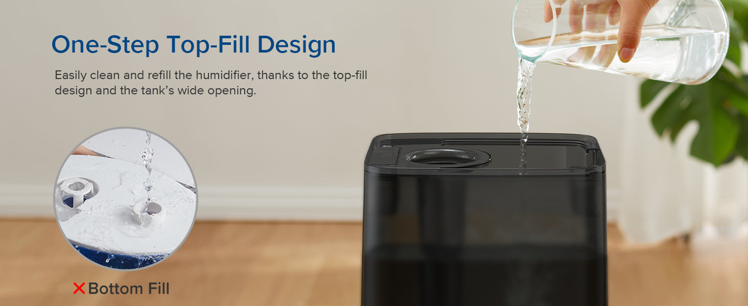 Luftfukteren er svært stillegående, med et lydnivå på under 30dB, slik at den ikke forstyrrer nattesøvnen din. I tillegg sørger toppfyllingsdesignet for at du enkelt kan fylle på vann uten søl eller søking etter en plass å snu tanken opp ned. Den gjennomsiktige vanntanken lar deg også se vannivået til enhver tid, så du alltid vet når det er tid for påfylling.